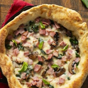 This Chicago-inspired ham and mushroom pizza is made with store-bought pizza dough and baked in a cast-iron skillet for quick and easy preparation. INGREDIENTS DIRECTIONS Tip: Garnish with basil or parsley before serving.