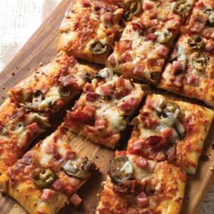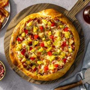 Topped with scrambled eggs, tropical pineapple, savory ham and smoky bacon, this yummy breakfast pizza makes a hearty and delicious way to start the day. INGREDIENTS DIRECTIONS Tip: Substitute red bell peppers with fresh or pickled jalapeño pepper slices if preferred.