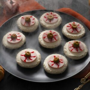 Fun to prepare and fun to eat, this spooky appetizer is perfect for Halloween cocktail parties. INGREDIENTS DIRECTIONS Tip: Add some red food coloring to the red pepper jelly to accentuate the red color if desired.