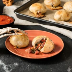 Kids will have fun helping to assemble these Halloween party appetizers! You can make them ahead, refrigerate on trays and bake just before serving. INGREDIENTS DIRECTIONS Tip: Add a sprinkling of herbs to the top of the jack-o’-lanterns to create green hair.