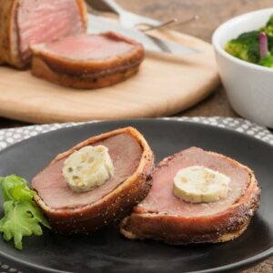 The holidays create a perfect excuse to impress guests, especially with an indulgent meal featuring beef, bacon, whiskey and cheese! INGREDIENTS Whiskey Butter: Blue Cheese Compound Butter: DIRECTIONS Tip: To make ahead, prepare bacon-wrapped tenderloin; wrap tightly with plastic wrap and refrigerate on a pan or in dish for up to 2 days.
