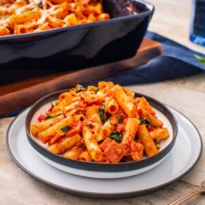 With spinach, ham and roasted red peppers, this comforting baked pasta with tomato sauce is one dish that everyone will love. Store-bought prepared roasted red peppers in a jar cuts down on prep time. INGREDIENTS DIRECTIONS Tip: Substitute kale or Swiss chard for spinach if desired.