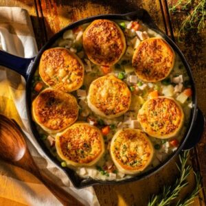Topped with refrigerator biscuits, this one-pan turkey pot pie packed with fresh herbs is homey, comforting and easy to make for a weeknight dinner. INGREDIENTS DIRECTIONS Tip: Use classic or flaky refrigerator biscuits, as desired. Substitute potatoes with sweet potatoes if preferred.