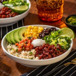 This tasty ham, rice and black bean burrito bowl is loaded with fresh herbs and punches of lime, Tex-Mex seasoning, avocado and chipotle. INGREDIENTS DIRECTIONS Tip: Substitute brown rice with quinoa, farro or your favorite whole-grain medley.